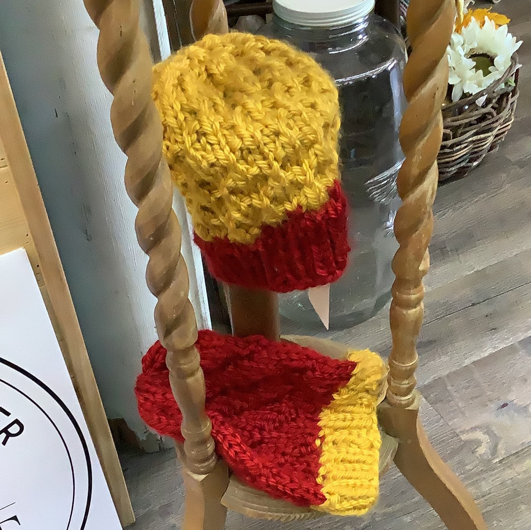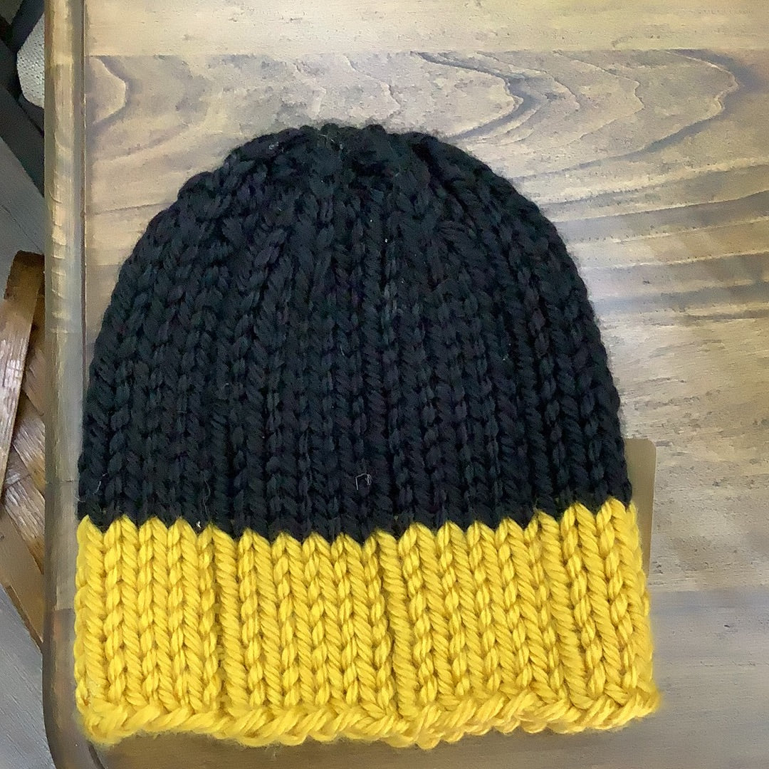 Hand knit teen/adult hat. Easy care machine wash, air dry.