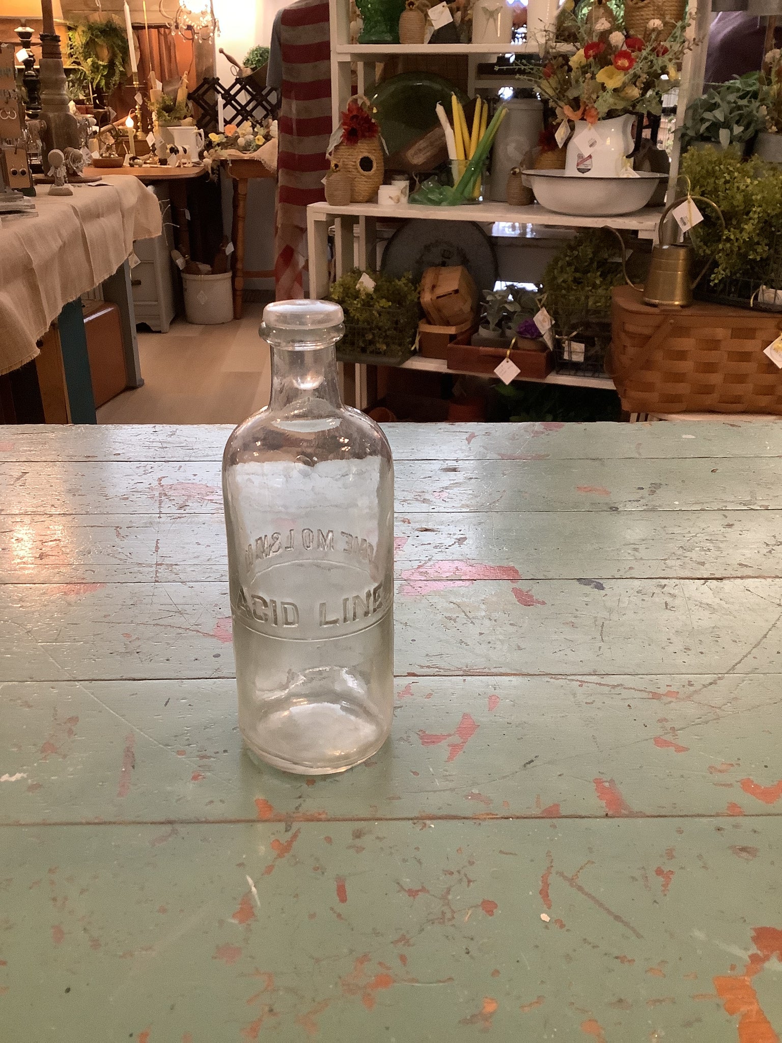 Clear glass apothecary bottle w glass stopper. 5.5” tall. No chips or cracks.