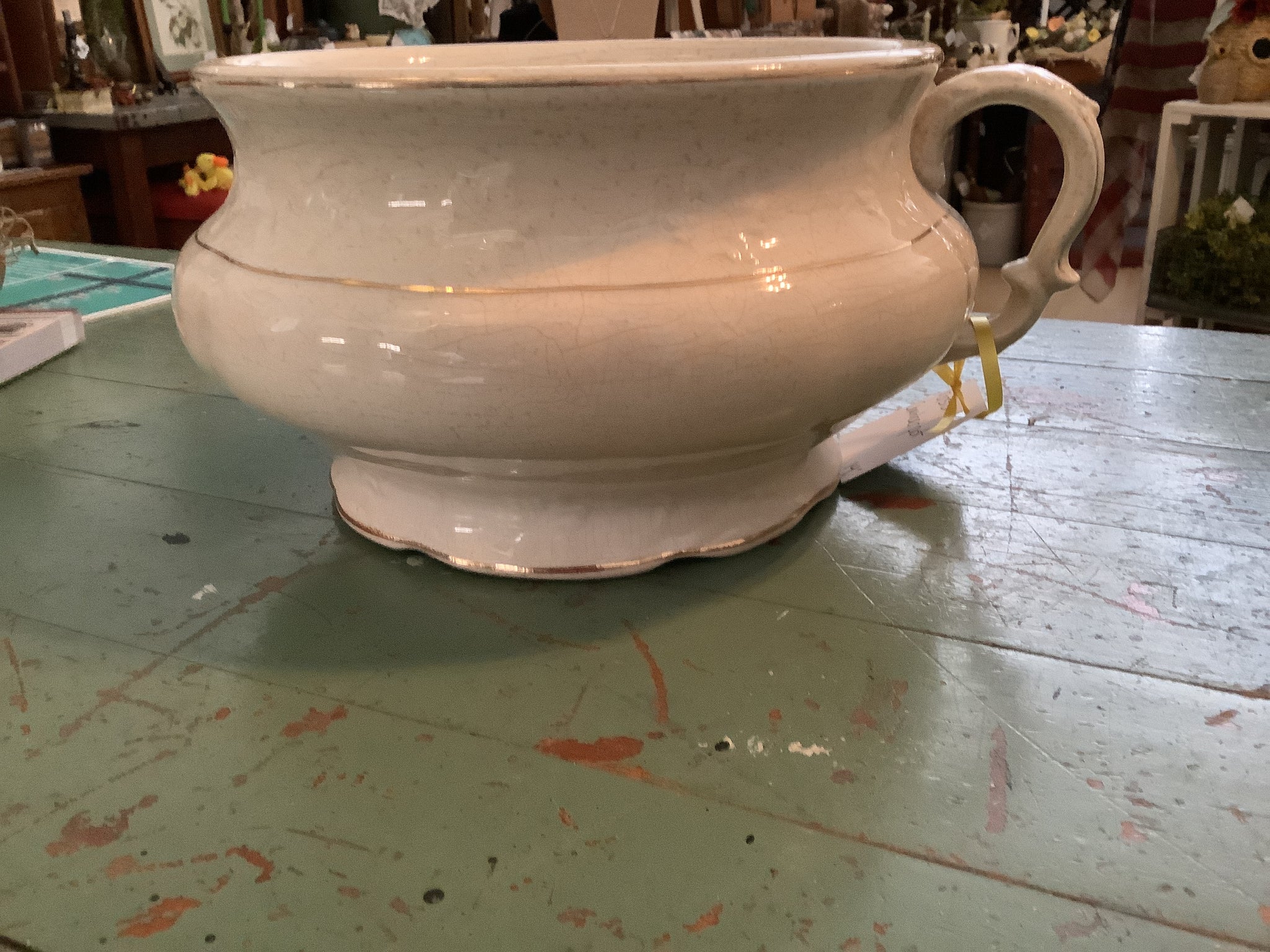 White with gold trim, beautiful staining and crazing. Knowles, Taylor & Knowles. No chips or cracks. 9,5” diameter excluding handle. 5.5” tall.