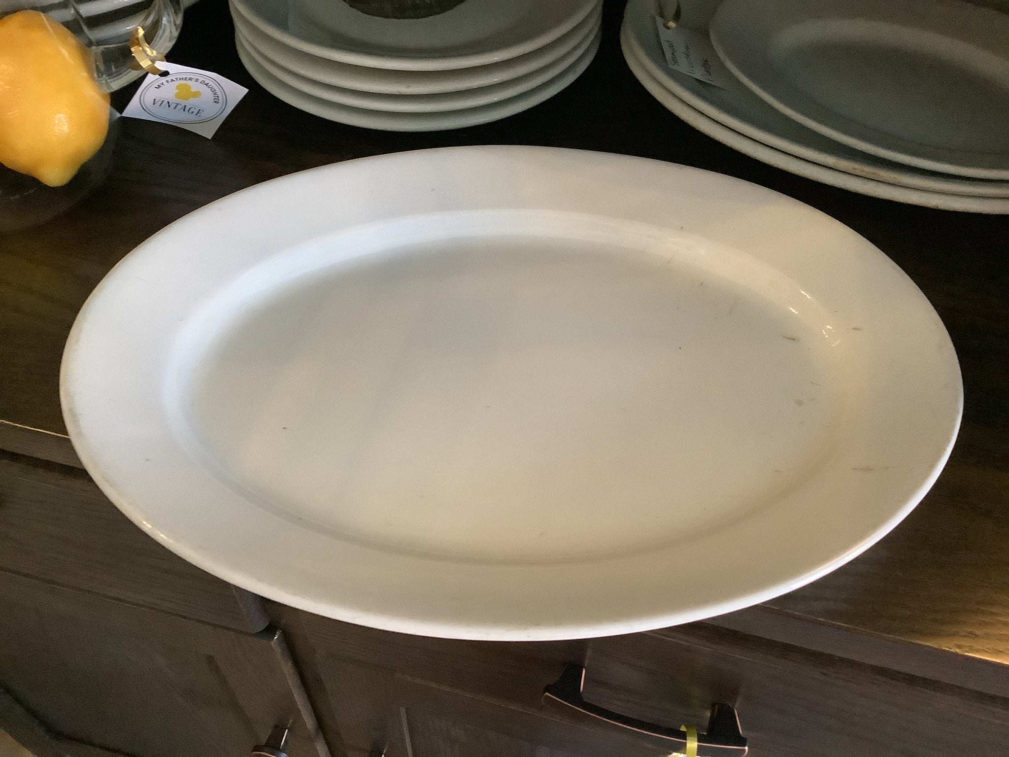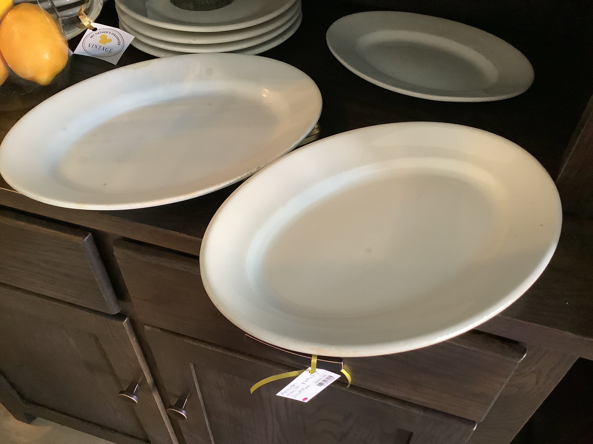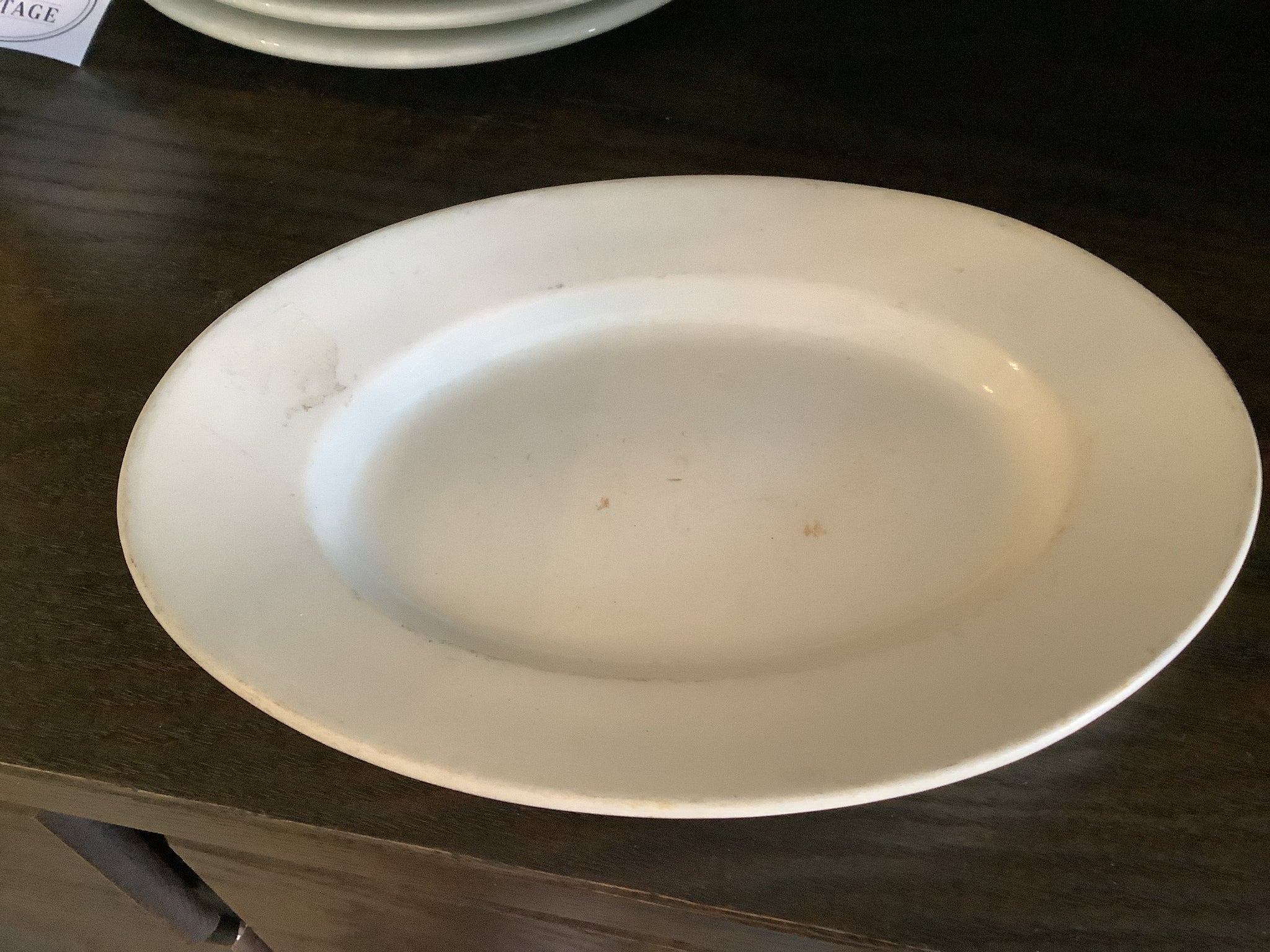 Medium white platters, JG Meakin and Grindley England stamps. 12 1/4” x 8 3/4”.