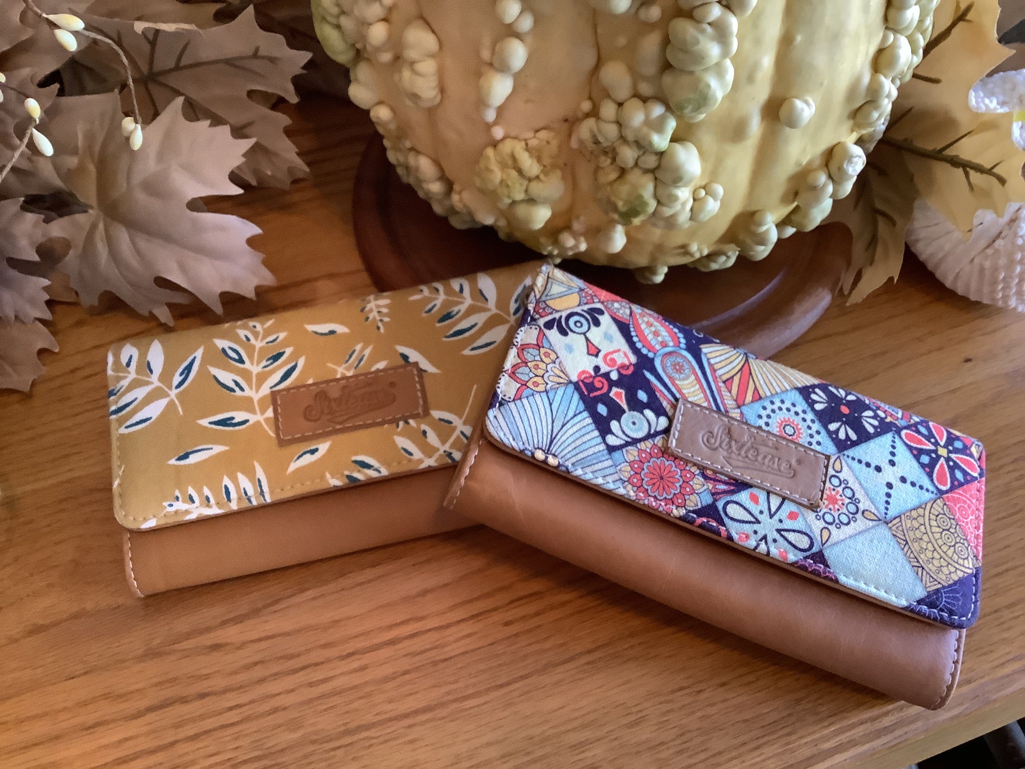 Beautiful and stylish leather and heavy cotton duck fabric. Snap closure with card holder section, zippered compartment and three sections to keep you organized. 7.5” x 4”.