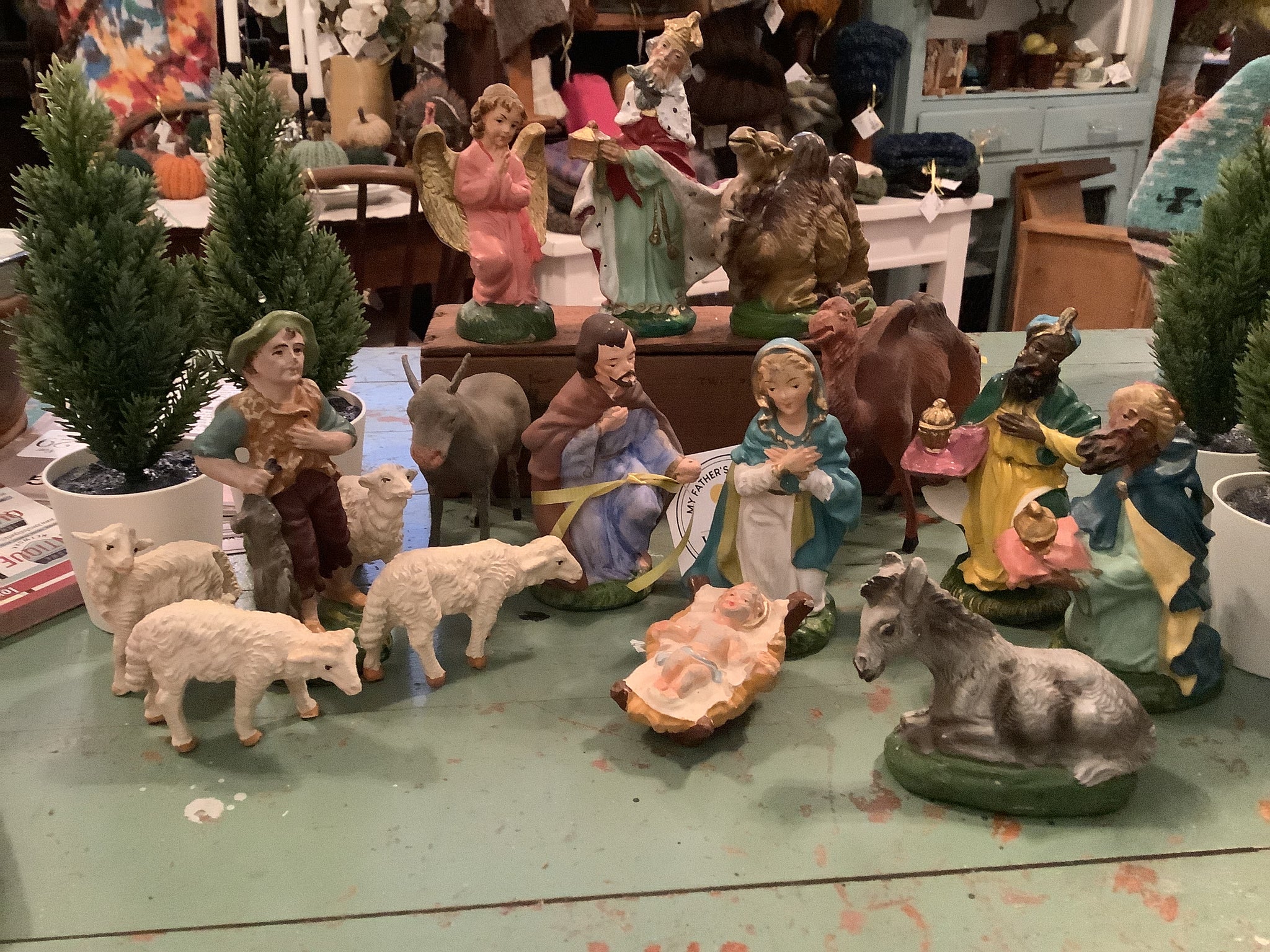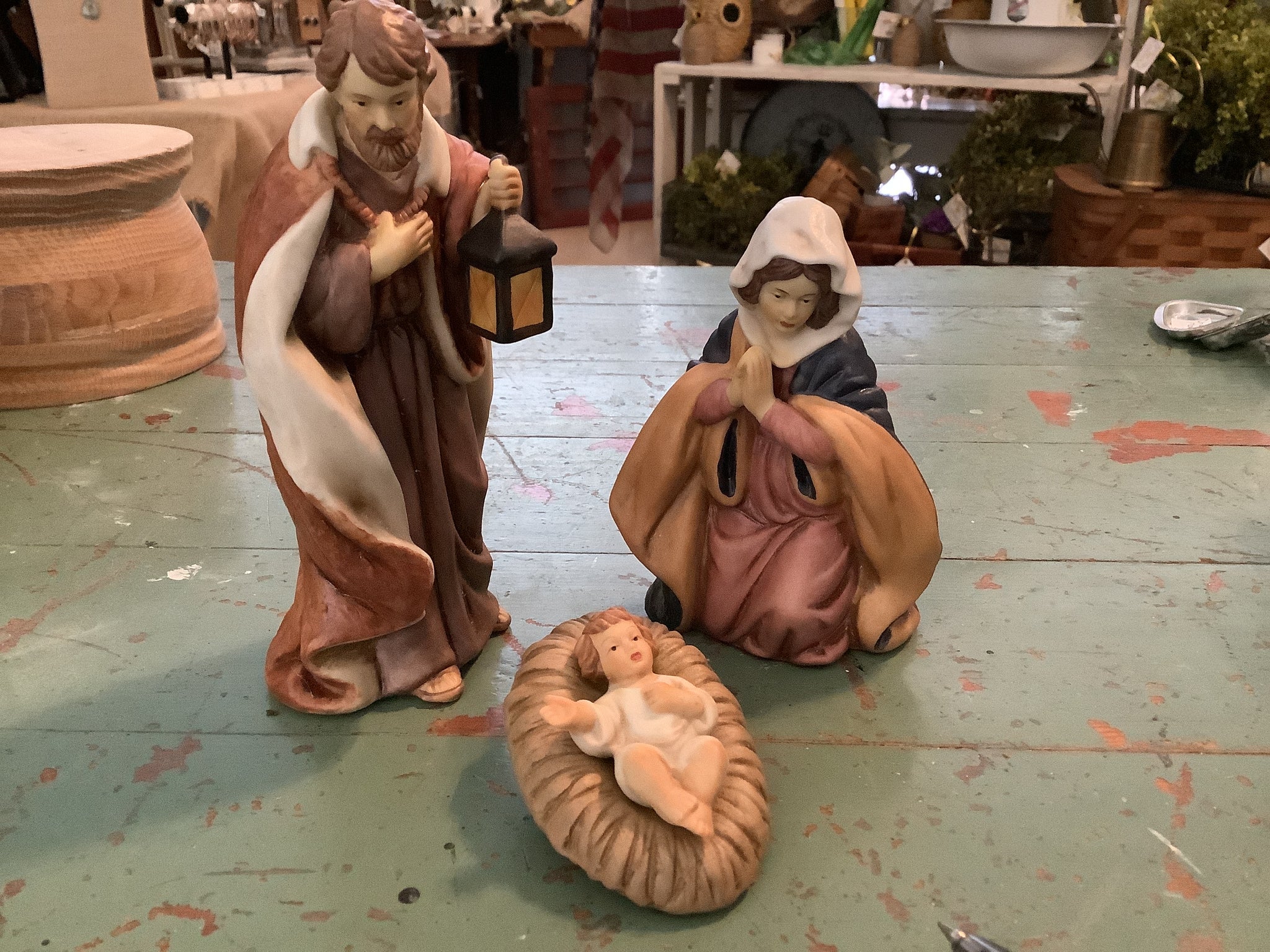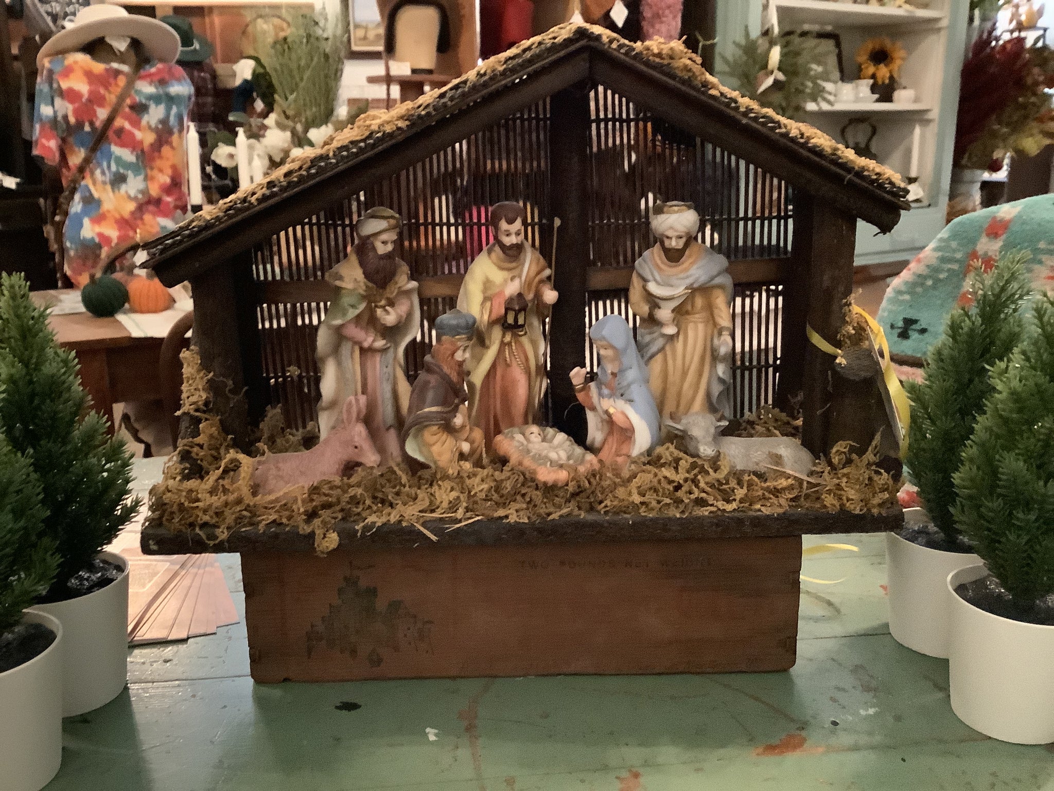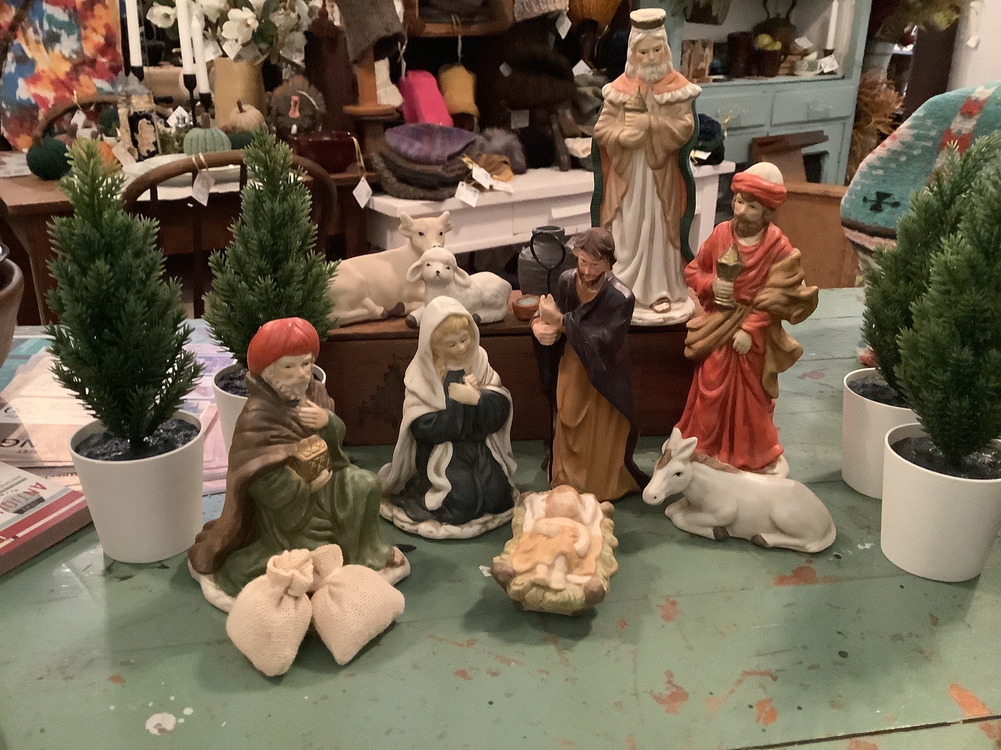 Variety of nativity scenes in assorted sizes and configurations.