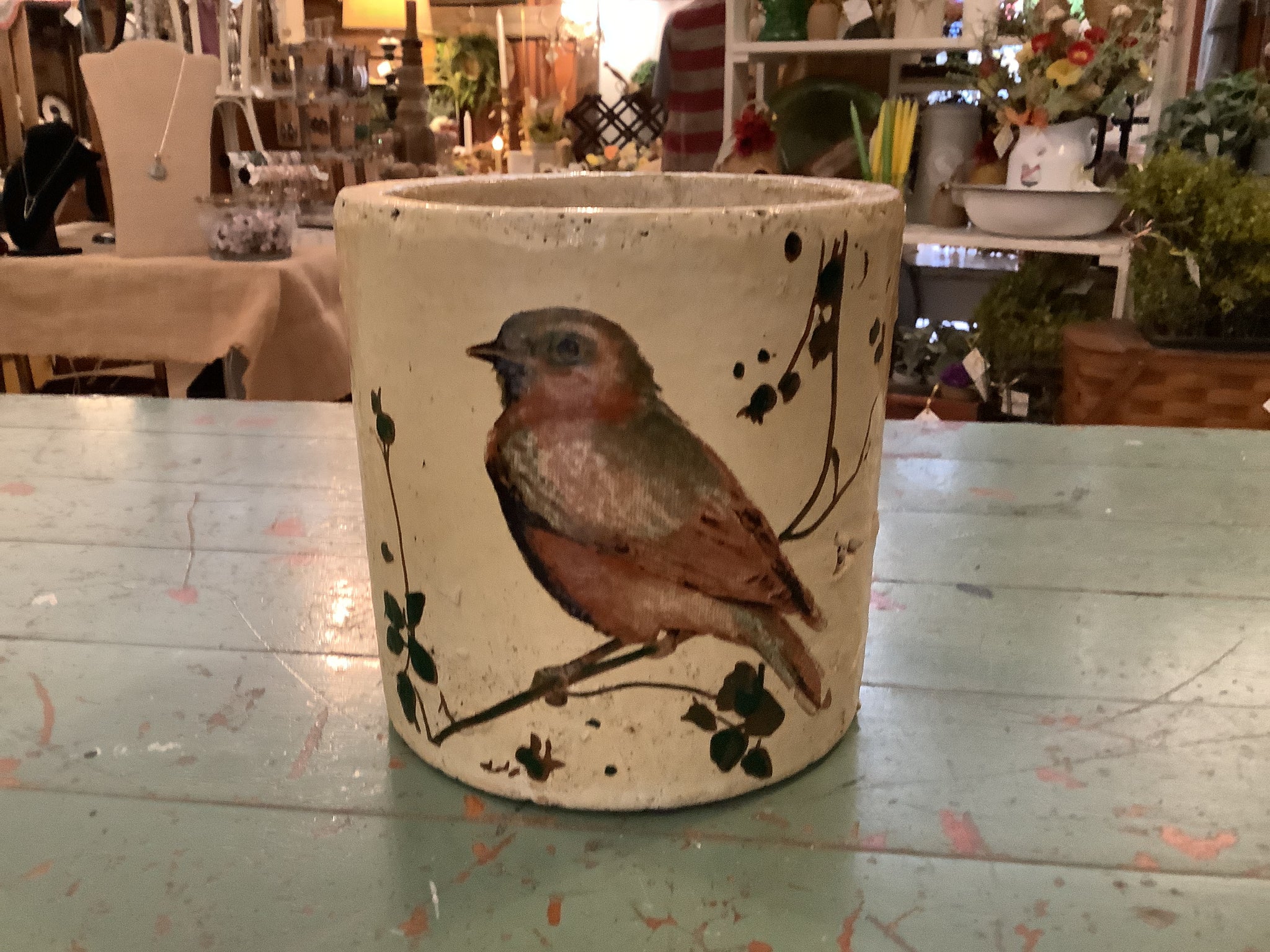 Rustic look with bird transfer. 5 3/4”d, 5 3/4”t.