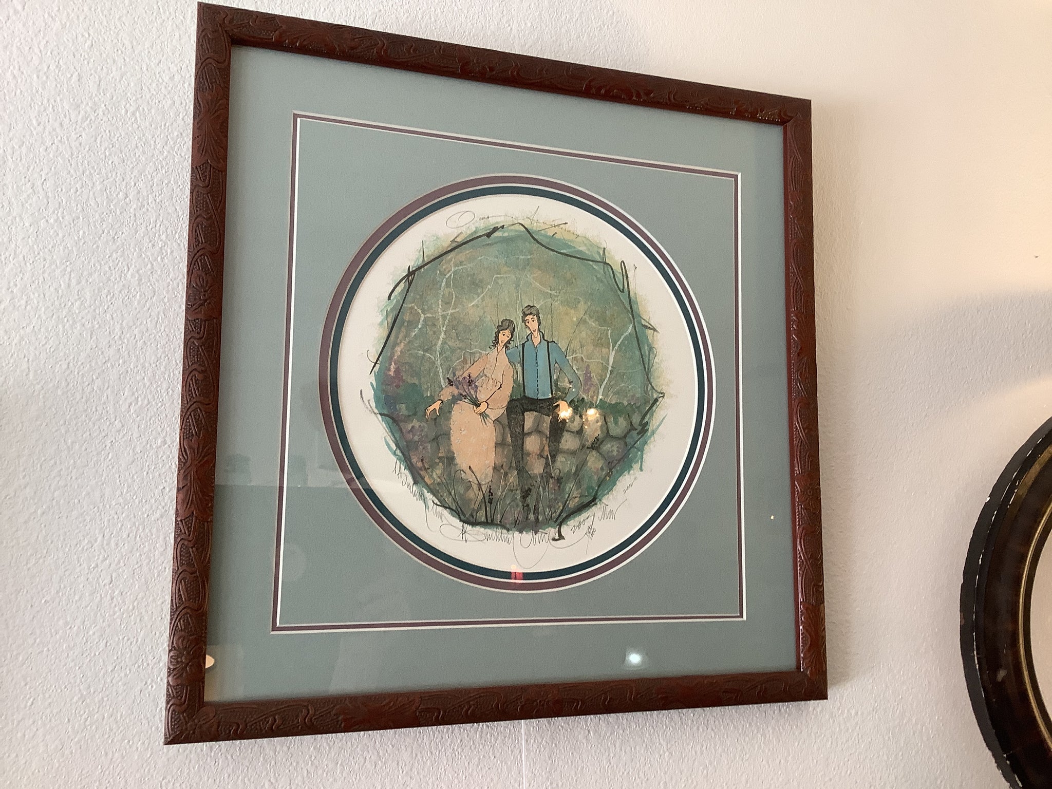 ”Our Anniversary” triple matted in a patterned wood finish 17” x 17” frame.
