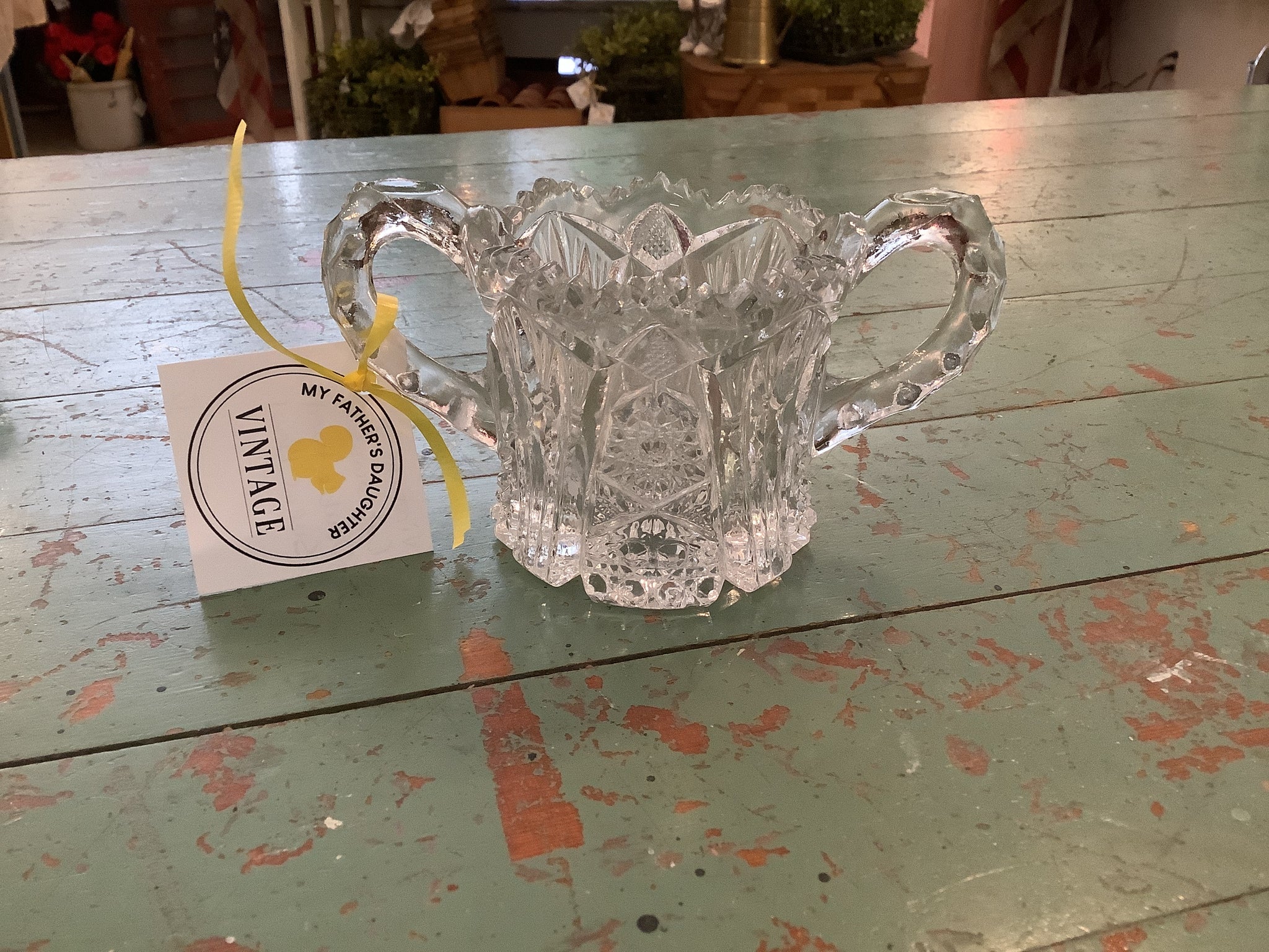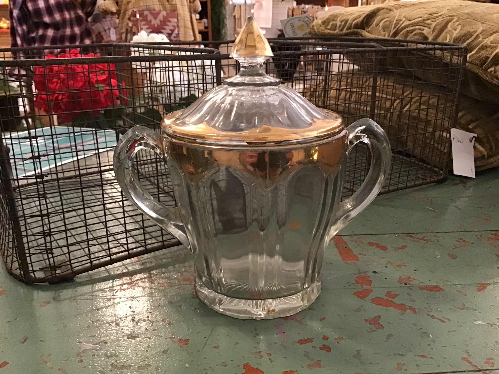 Vintage pressed glass sugar bowl with lid and gold colored detail. Beautiful with other farmhouse, cottage or cabin decor. Good condition, no chips or cracks. 7” handle to handle, 8” height with lid.