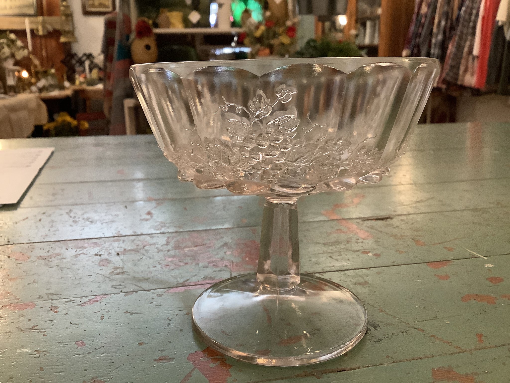 Vintage pressed glass paneled Grape Harvest made by Wright Glass. Clear serving dish, commonly used for serving sorbet or dessert. Good vintage condition without chips or cracks.