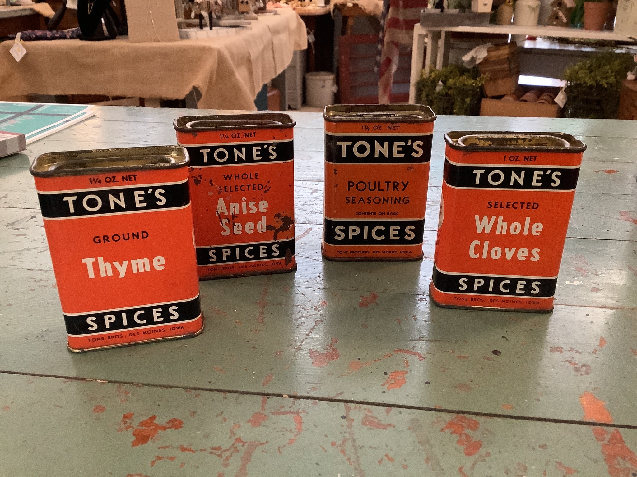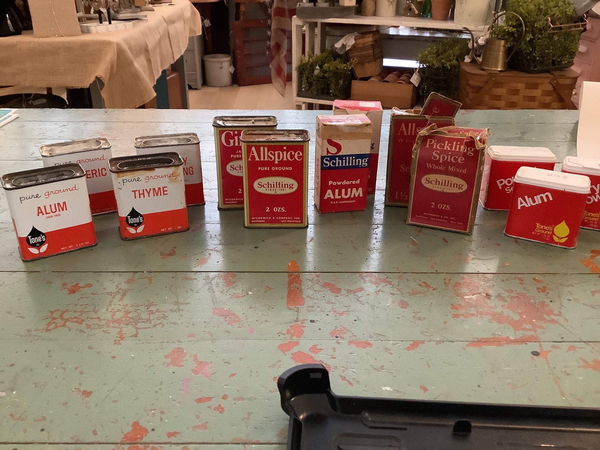 Assorted vintage spice tins.