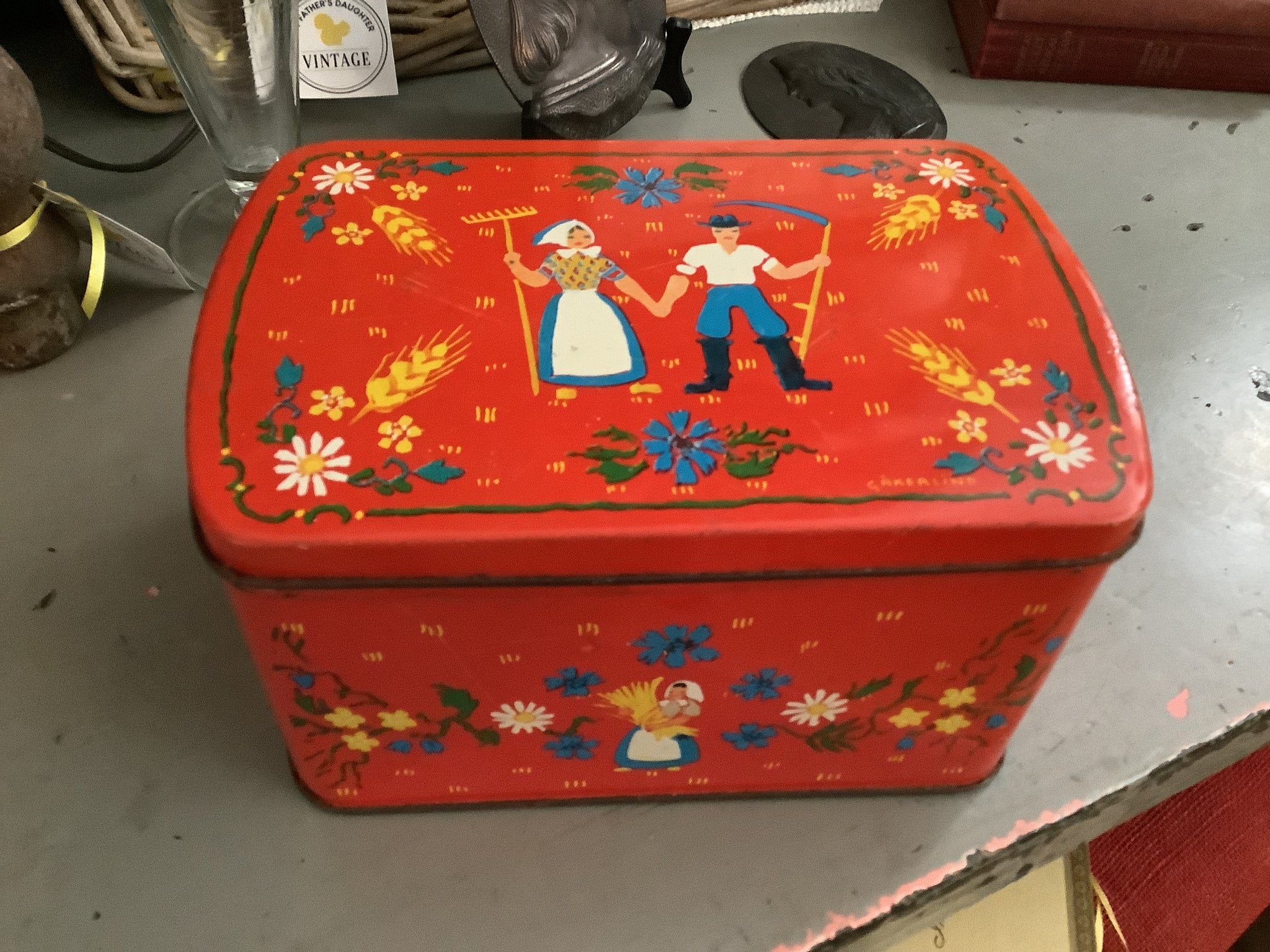 1940’s red with harvest themed designs. Good vintage condition, with minor scratches and surface rust.