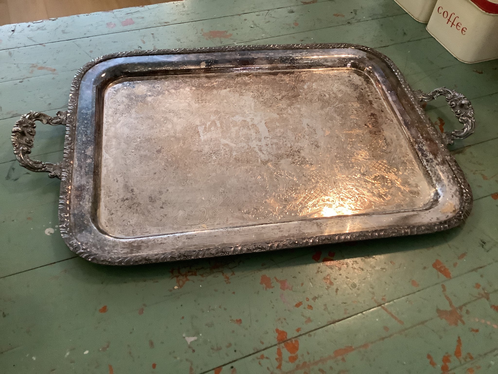 Assorted vintage silver-plate trays in various shapes and sizes.