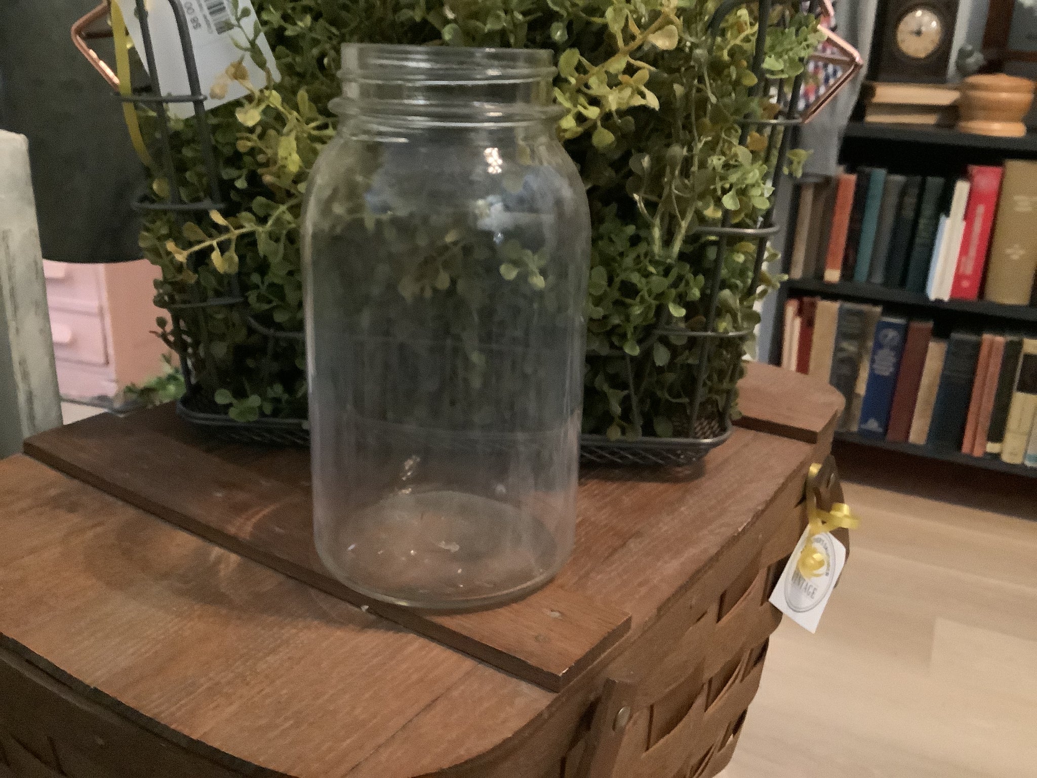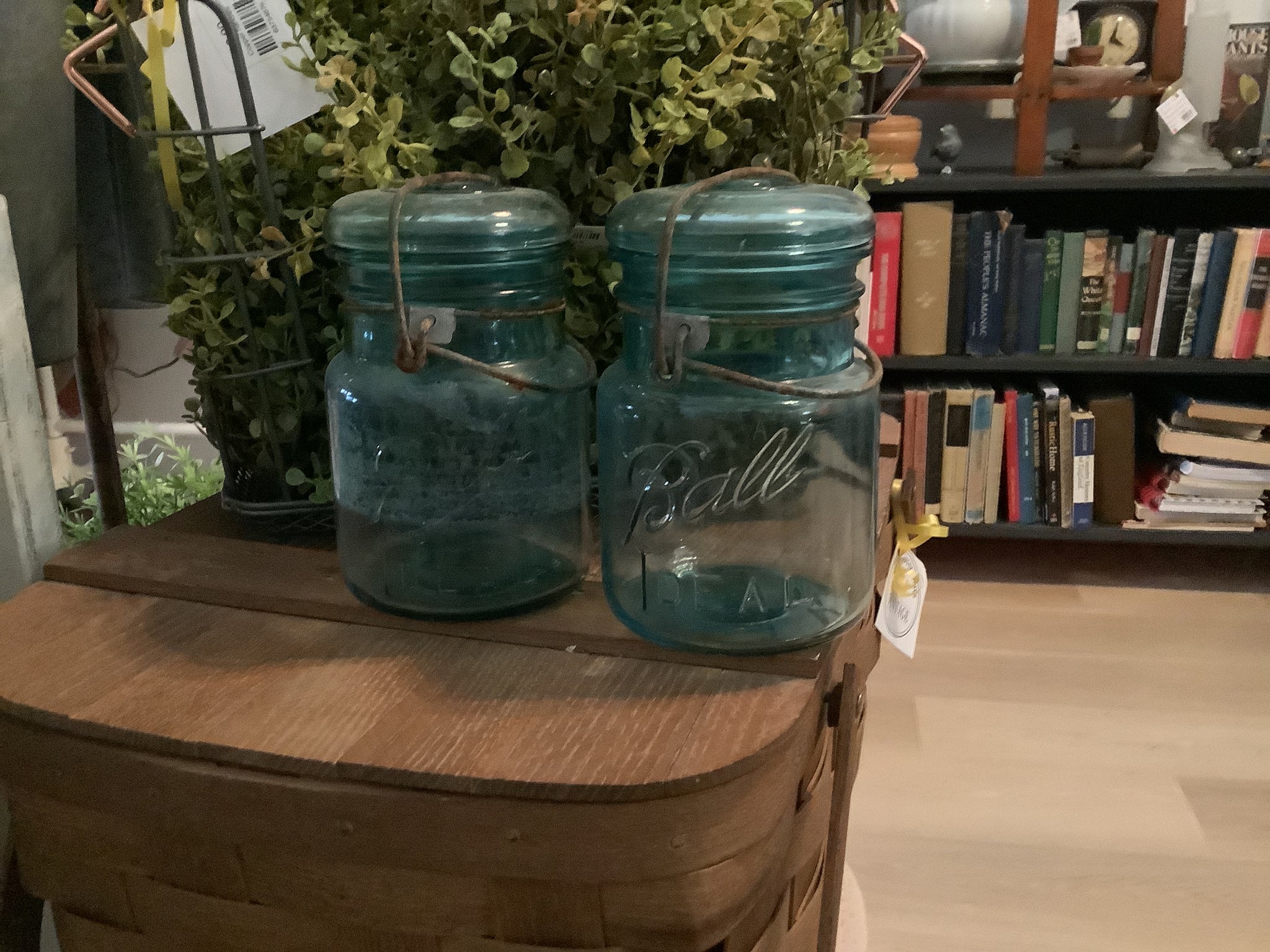 Assortment of vintage canning jars. Variety of sizes, colors and brands. Some with lids, some with collections.