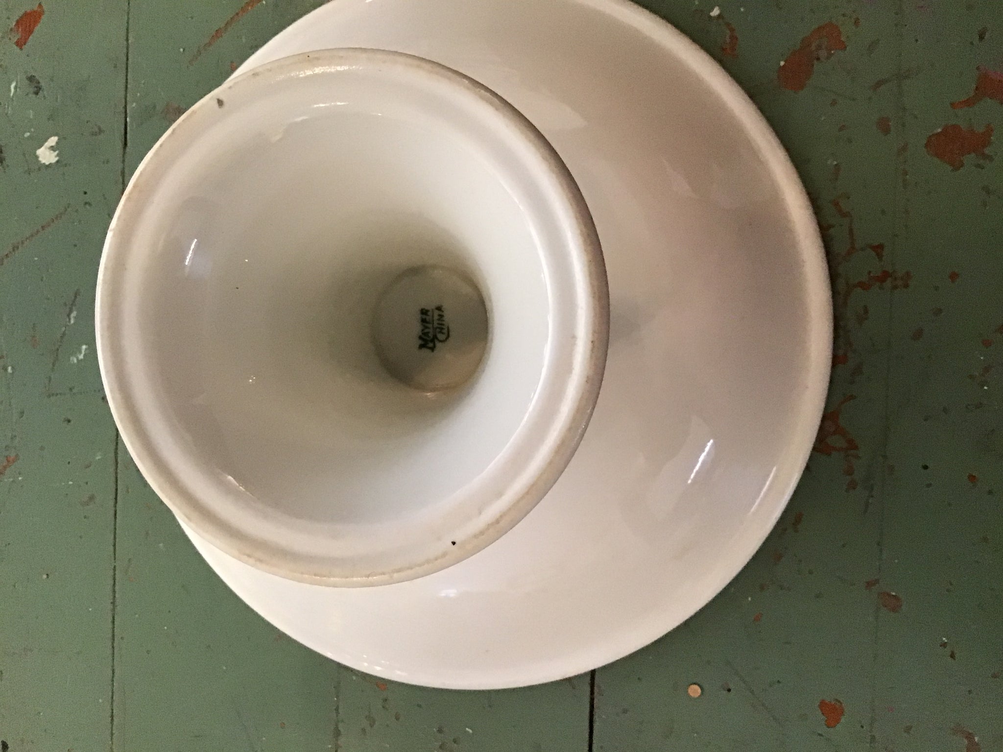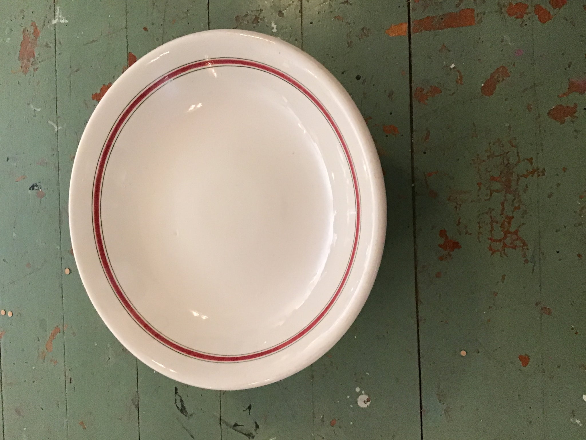 Mayer compote with red and green stripe accents. 9” diameter, 4” tall. No chips or cracks.