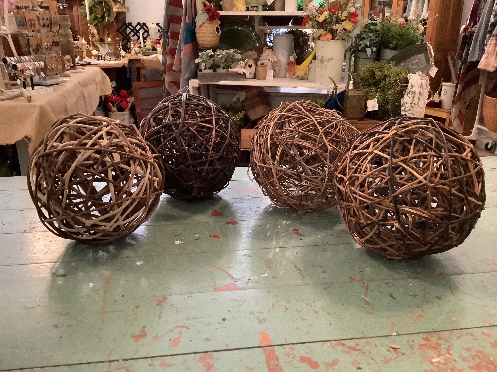 Assorted home decor made from wicker or grapevine materials. Variety of styles and sizes.